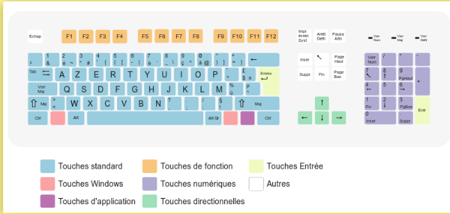 En bleu : Les touches les plus utilisées, notamment pour la frappe de documents : lettres, chiffres, signes de ponctuation, majuscules, minuscules…