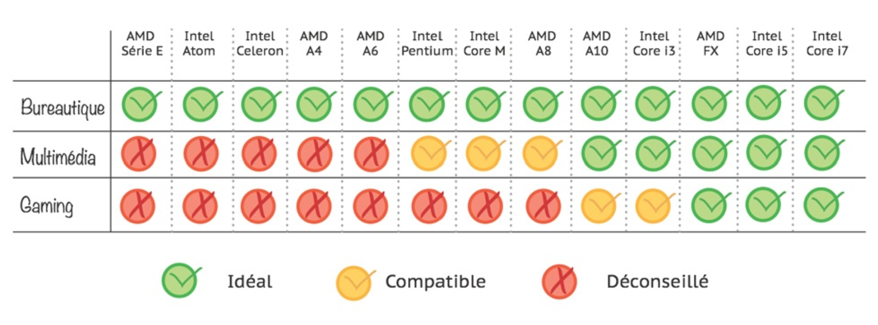 AMD et Intel proposent une gamme assez large, mais force est de constater qu'Intel est un peu seul sur le segment "performance". Pour autant, AMD ne propose pas des processeurs au rabais et se bagarre un peu plus sur le rapport performance / prix sur l'entrĂ©e et le milieu de gamme. La course Ă la frĂ©quence et au nombre de cĆurs Ă©tait trĂšs en vogue il y a quelques annĂ©es, mais elle est dĂ©sormais moins d'actualitĂ©. Pour gagner en performance, les deux protagonistes amĂ©liorent et optimisent surtout le fonctionnement interne des processeurs, c'est-Ă -dire leur architecture. ParallĂšlement aux performances, AMD comme Intel travaillent Ă rĂ©duire la consommation Ă©lectrique des CPU qui, entre deux gĂ©nĂ©rations, sont moins Ă©nergivores tout en Ă©tant plus rapides.