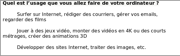 La rĂ©ponse Ă cette question est plutĂŽt simple. Lors de lâachat dâun matĂ©riel informatique, le plus important est de savoir ce que vous allez faire avec. La rĂ©ponse Ă cette question va avoir une influence sur le prix, le type dâordinateur (fixe ou portable), et la puissance dont vous aurez besoin. Tout dĂ©pend donc de ce que vous voulez en faire !