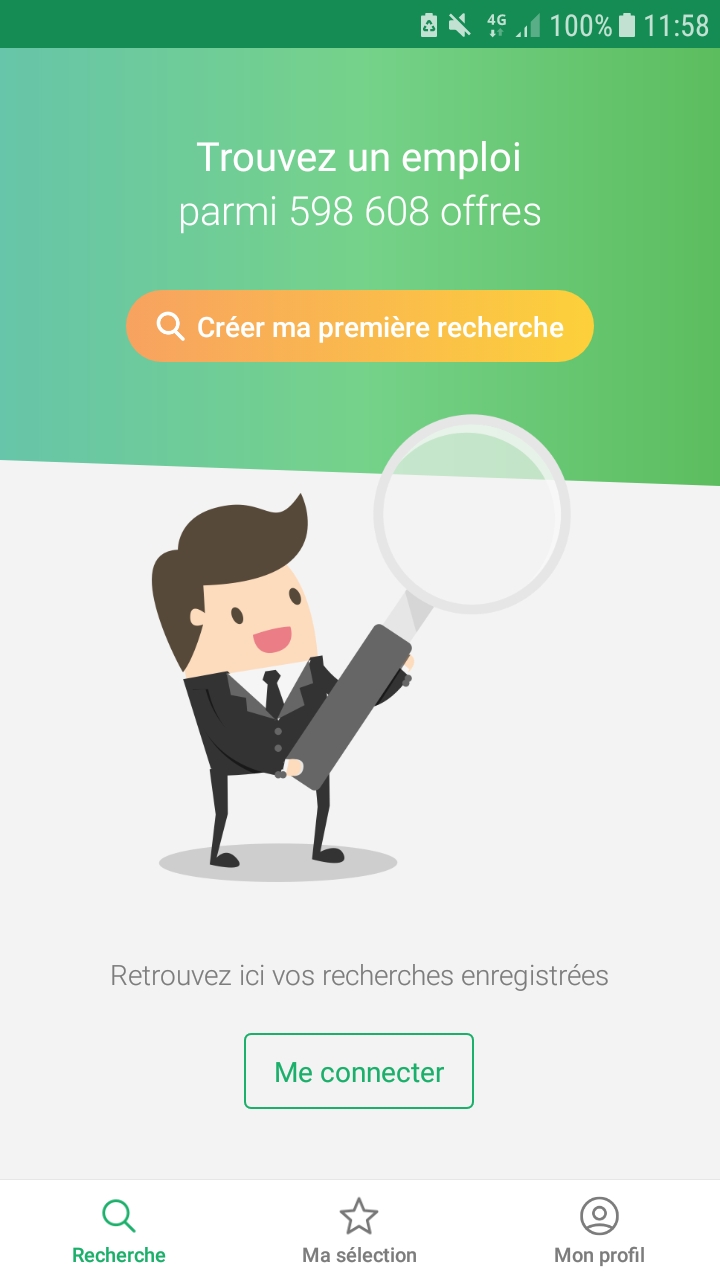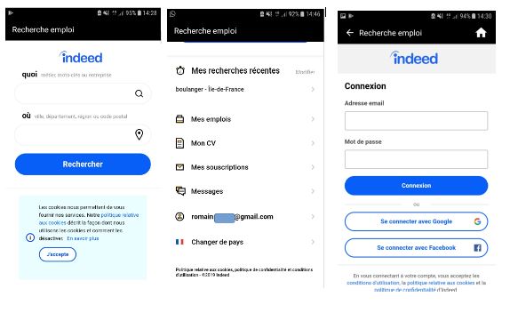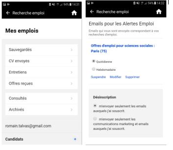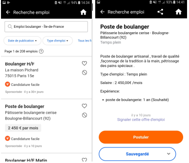 Lâapplication, plus sommaire, ressemble largement au site Internet. PossibilitĂ© de se connecter Ă son compte, dâen crĂ©er un ou de postuler sans se connecter Ă des offres(« Postuler » => « TĂ©lĂ©chargez votre CV »). Certaines fonctions plus avancĂ©es sur le site nâapparaissent pas, notamment en ce qui concerne la recherche avancĂ©e.