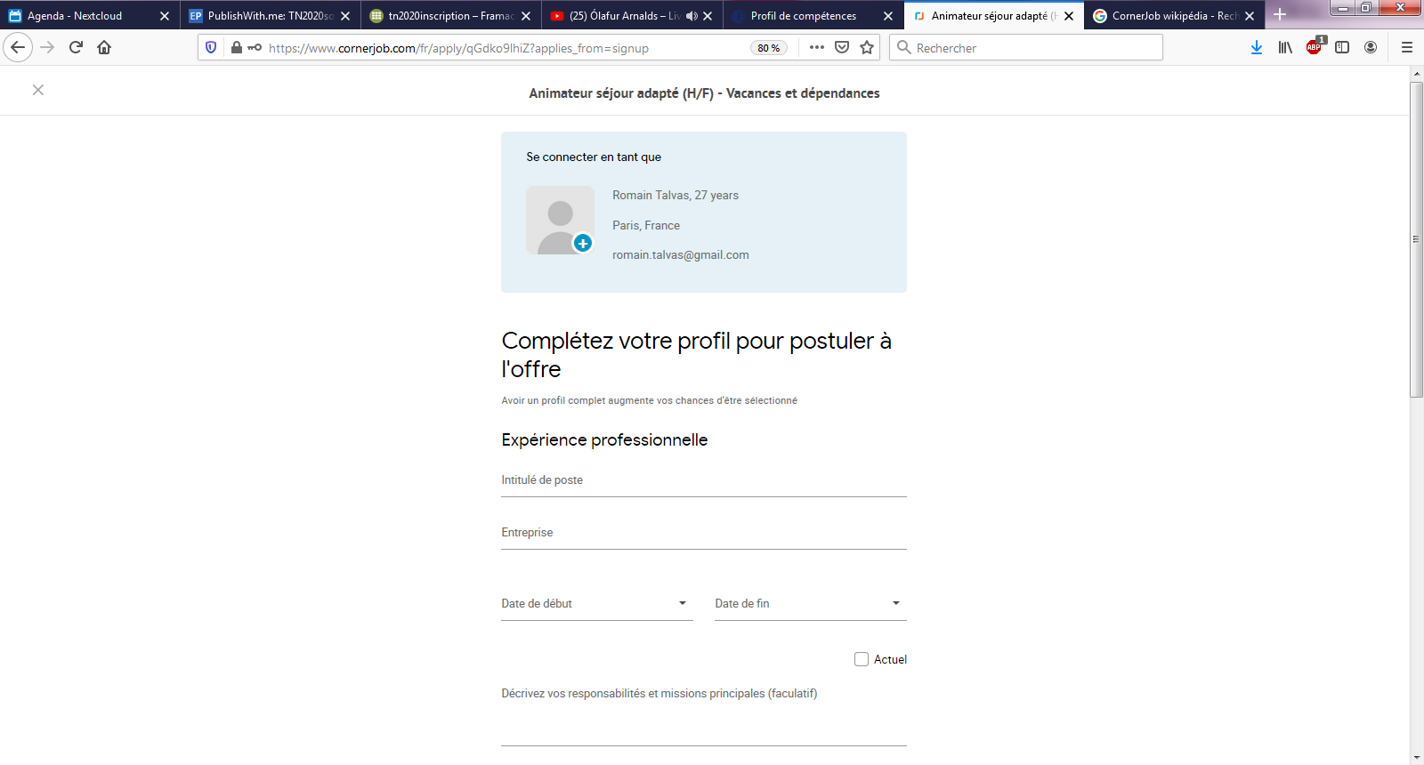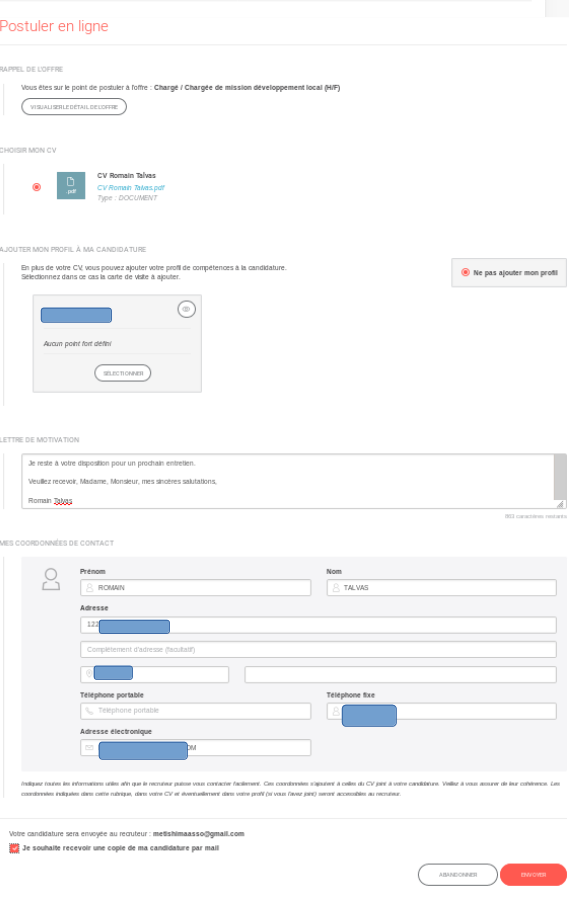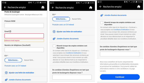 Candidater, comme sur le site, implique de renseigner quelques informations dont prénom et nom, email, de fournir un CV (Inded ou importé) et éventuellement une LM (+ quelques questions supplémentaires).