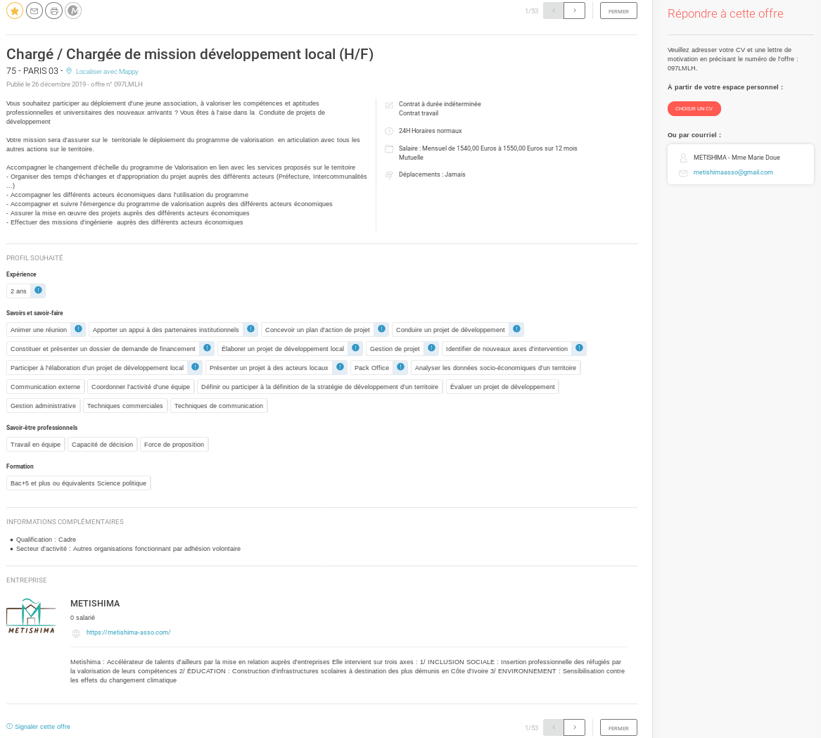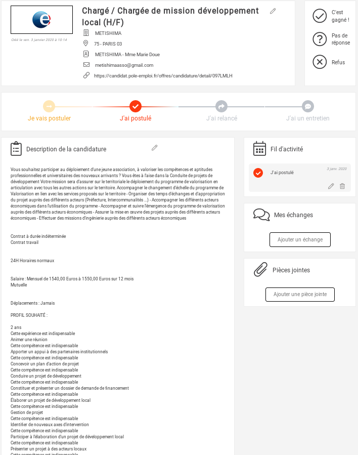 Page dĂ©taillĂ©e dâune offre dâemploi dans la rubrique « jâai postulĂ© ». PossibilitĂ© dâajouter des informations si contact par tĂ©l ou email (« Mes Ă©changes »), dâajouter une note, en indiquant « câest gagnĂ© » ou « refus » lâoffre sera archivĂ©e dans « candidatures terminĂ©es »âŠ