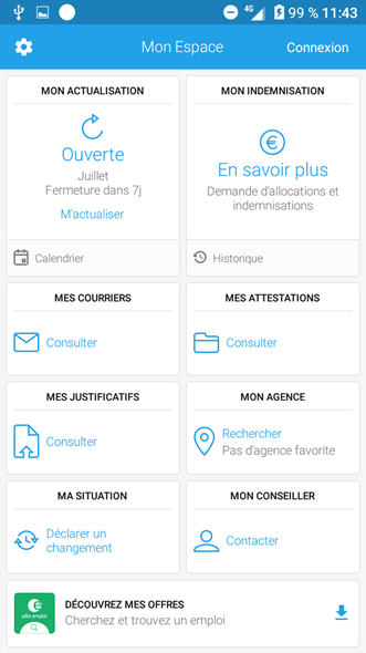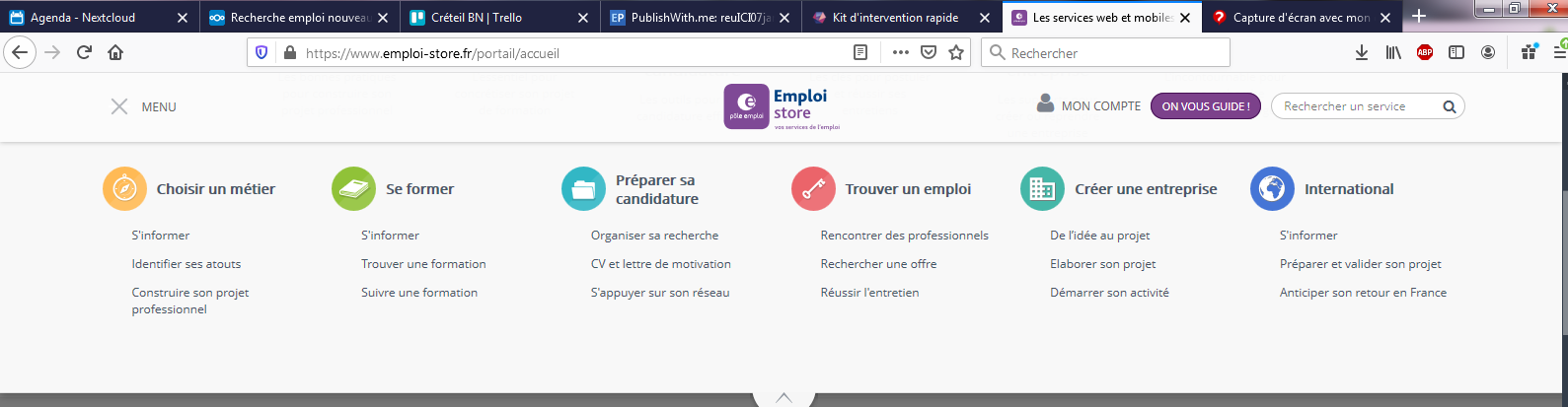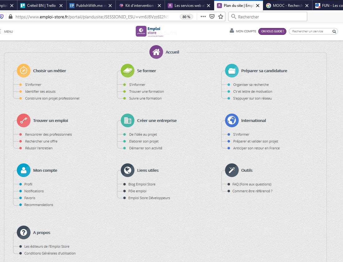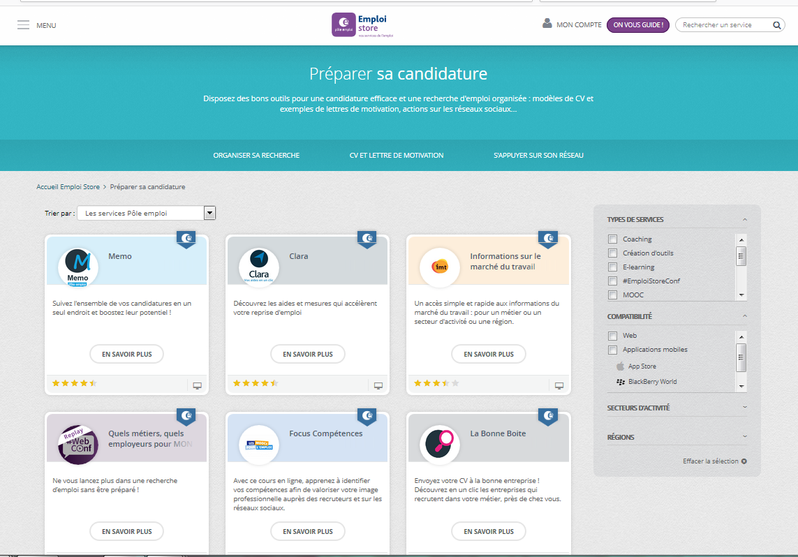LâEmploi Store est un site, mis notamment en place par PĂŽle Emploi, qui recense tout un ensemble de sites et dâapplications en lien avec la recherche dâemploi au sens large : des mĂ©thodes de crĂ©ation du CV et de la LM aux sites de recherche dâoffres dâemploi et de formations, en passant par des sites dĂ©diĂ©s aux MOOC pour amĂ©liorer ses compĂ©tences/connaissances dans divers domaines (langues, management, environnementâŠ). On peut sây connecter au moyen de son identifiant et mot de passe associĂ©s Ă son compte PĂŽle Emploi ou en crĂ©ant un compte (favoris, notifications etc.).