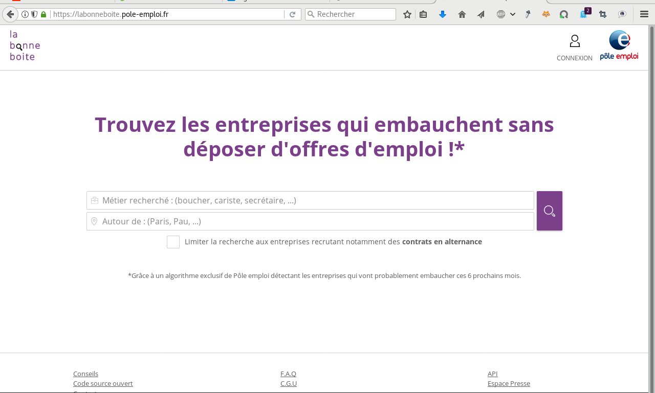 Mieux quâun annuaire, La Bonne Boite cible pour vous uniquement les entreprises nâayant que des perspectives Ă©levĂ©es dâembauche. Utiliser ce nouveau service va vous permettre dâĂȘtre plus efficace dans vos dĂ©marches spontanĂ©es, en limitant lâenvoi alĂ©atoire de candidature, en limitant les retours nĂ©gatifs et en augmentant vos chances de dĂ©crocher un entretien dâembauche. » « La bonne boĂźte » recense des entreprises et autres structures qui sont susceptibles de recruter dans les 6 prochains mois. Il est possible de se connecter au site via son compte PĂŽle Emploi.