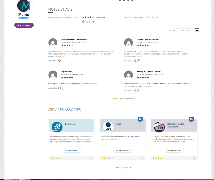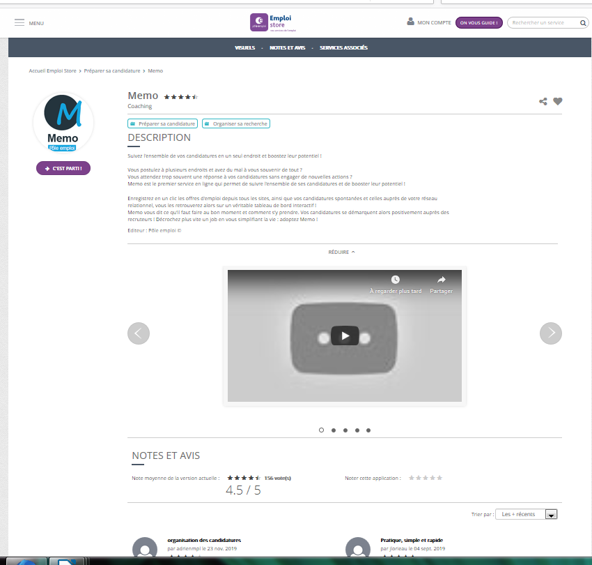 Sera Ă©galement prĂ©sentĂ© lâEmploi Store et quelques sites partenaires (emploi, formation), dont Memo, qui permet dâorganiser sa recherche dâemploi (Ă©tat des candidatures, historique des actions...).