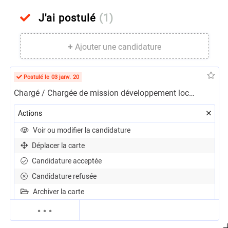 CatĂ©gorie jâai postulĂ©, possibilitĂ© de voir/modifier la candidature, de dĂ©placer la carte dâune catĂ©gorie Ă lâautre, dâarchiver lâoffre dans « candidatures terminĂ©es »...