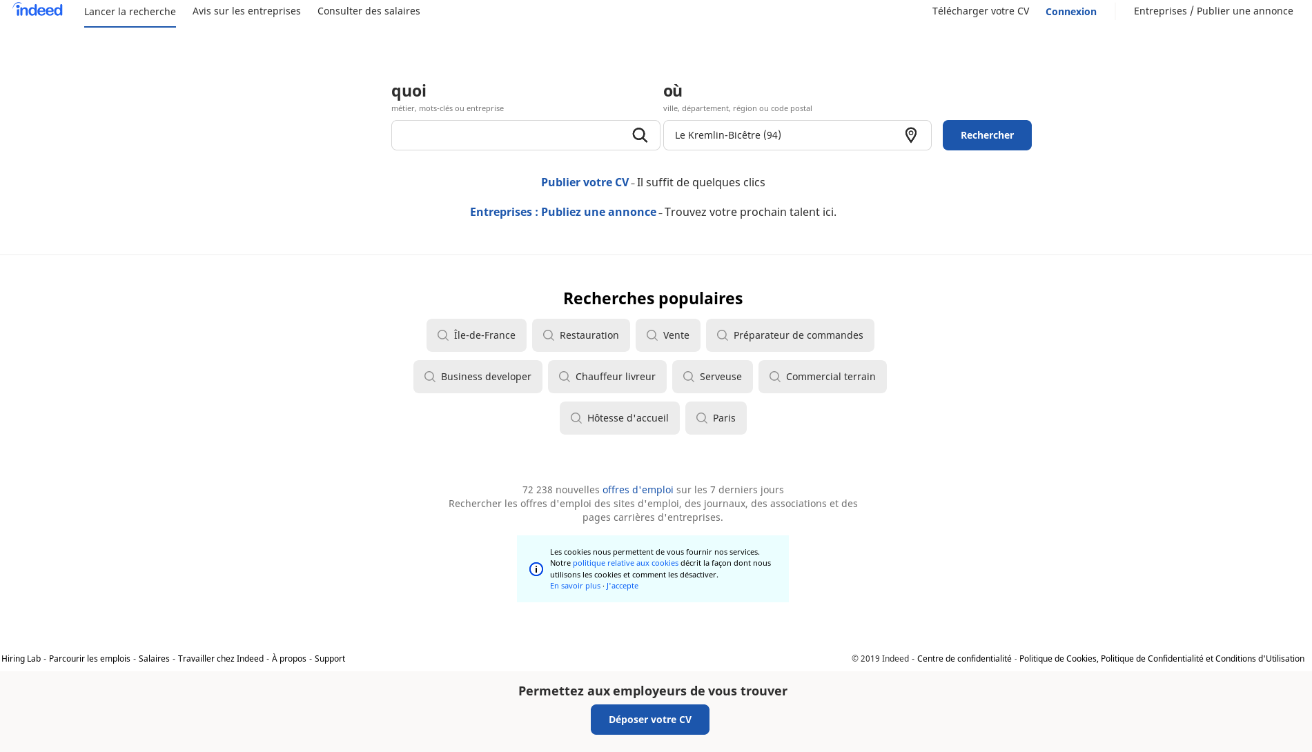 Indeed est le site leader de recherche dâoffres dâemploi. La plupart des offres que vous trouverez sur Indeed se retrouvera Ă©galement sur dâautres jobboards gĂ©nĂ©ralistes comme Monster ou KelJob. Indeed agrĂšge les offres disponibles sur dâautre sites de recherche dâemploi, gĂ©nĂ©ralistes ou spĂ©cialistes, qui peuvent Ă©galement provenir de journaux ou de pages dâentreprises.