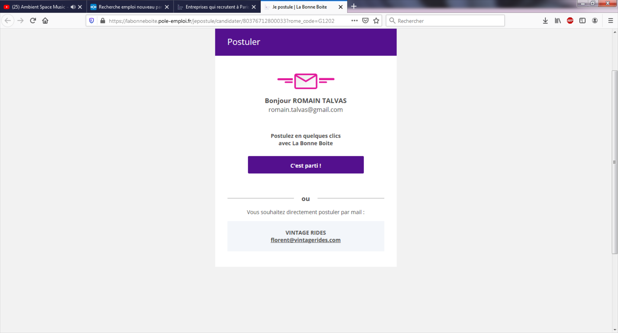 AprÚs avoir cliqué sur « Postuler » : deux options : faire une candidature spontanée via La bonne boßte ou la faire à partir de sa boßte e-mail personnelle.