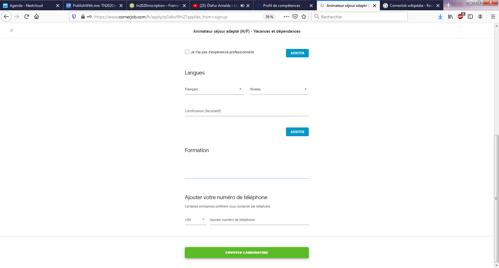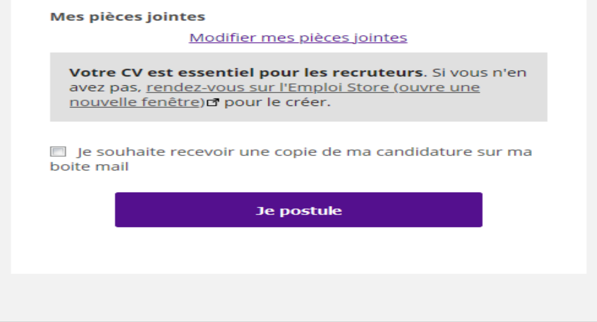 Le moment de candidater avec des informations Ă remplir : nom du poste / n° de tĂ©l + adresse / Ă©criture dâun e-mail⊠/ Dans un second temps, aprĂšs avoir cliquĂ© sur « Je continue », vous pourrez insĂ©rer des PJ : CV / LM, ...
