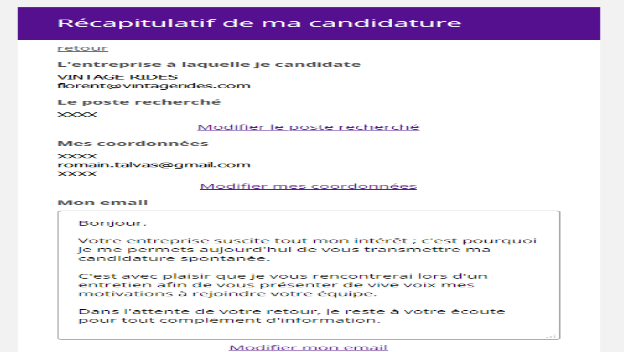La possibilitĂ© de postuler facilement, sans sortir du site. Un modĂšle de rĂ©ponse mail modifiable pour accompagner votre candidature. Lâoptimisation des rĂ©ponses des recruteurs, grĂące aux boutons de rĂ©ponse rapide ajoutĂ©s sur le mail de candidature (Refus / demande dâinformations complĂ©mentaires/Proposition de rendez-vous).