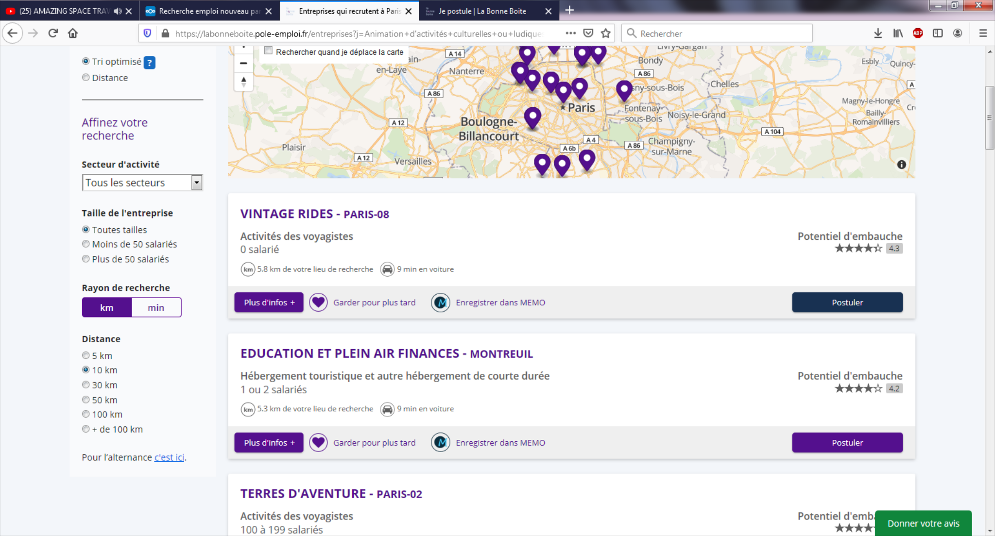 Si vous ĂȘtes donc confrontĂ©s Ă la difficultĂ© de cibler les entreprises auxquelles envoyer votre CV, PĂŽle emploi vous propose de tester ce service qui vous indique les entreprises qui ont le plus de chance de vous embaucher. Sur la base dâalgorithmes statistiques Ă©voluĂ©s, La Bonne Boite vous restitue une liste dâentreprises ayant une forte probabilitĂ© dâembaucher dans les 6 mois Ă venir.