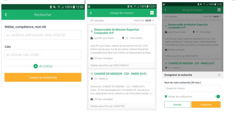 La recherche dâoffres dâemploi sâeffectue au moyen de « filtres » (date de parution de lâannonce, type dâemploi, tri par date ou pertinence). Les filtres sont moins nombreux que les multiples critĂšres qui permettent sur le site dâaffiner la recherche et donc les rĂ©sultats. Un filtre « Emplois compatibles mobile » permet de sĂ©lectionner les offres auxquelles il est possible de candidater au moyen du Smartphone.