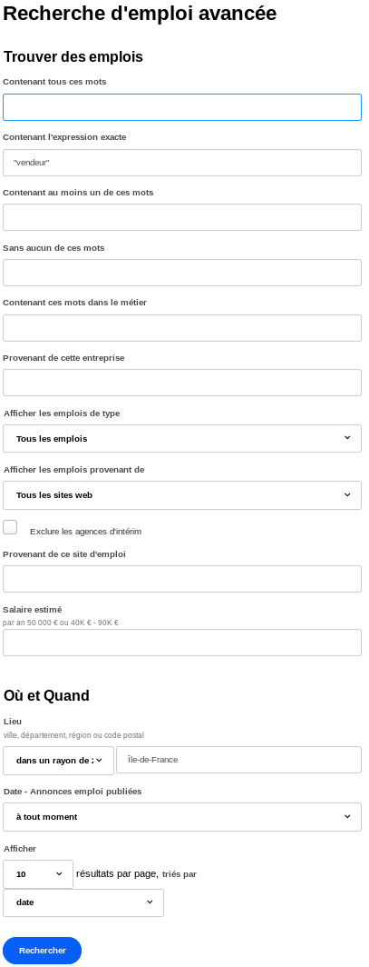 Recherche avancĂ©e avec des critĂšres plus prĂ©cis concernant les mots-clĂ©s, le type de contrat, la date de parution de lâannonce...
