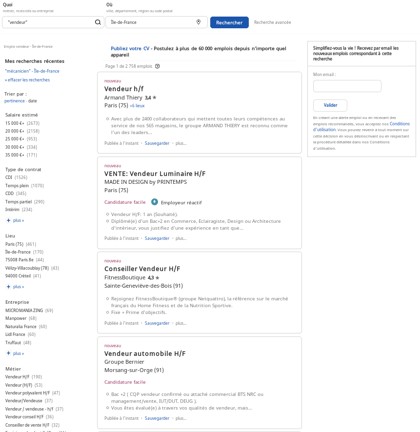 Page gĂ©nĂ©rĂ©e aprĂšs une recherche simple avec le mot-clĂ© « vendeur », « Ăle-de-France ».