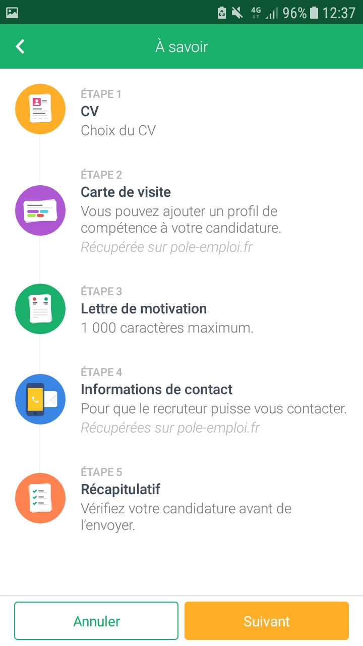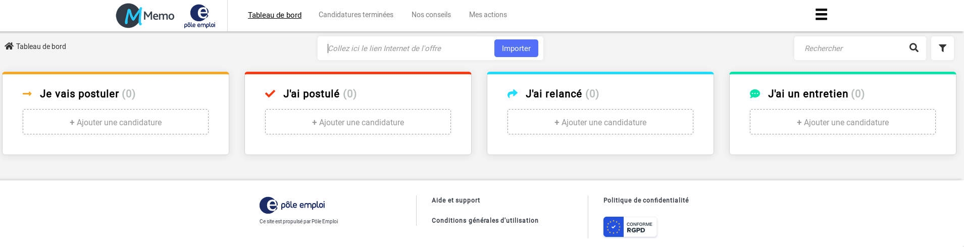 - AccĂ©der des petits conseils qui sâaffichent automatiquement pour chaque offre qui figure dans le tableau : postuler, relancer, remercier⊠+ « Recevez des alertes personnalisĂ©es. MEMO identifie pour vous, les actions prioritaires pour accĂ©lĂ©rer votre retour Ă l'emploi. Ces actions sont dĂ©terminĂ©es en fonction de l'Ă©tat de vos dĂ©marches »