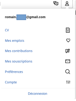 Rubriques du compte Indeed : gestion de CV (importé ou version Indeed), offres sauvegardées, avis laissés, alertes emails, paramÚtres du compte etc.